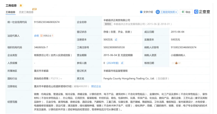 企查查显示,本次中标企业注册地址为重庆市丰都县名山街道新堤场村5组,注册资本500万元,2024年企业参保人数为0,经营范围涉及机电设备、管道设备、制冷设备、计算机软件、电子产品等的销售以及装潢设计、货运代理、绿化养护等多个领域。